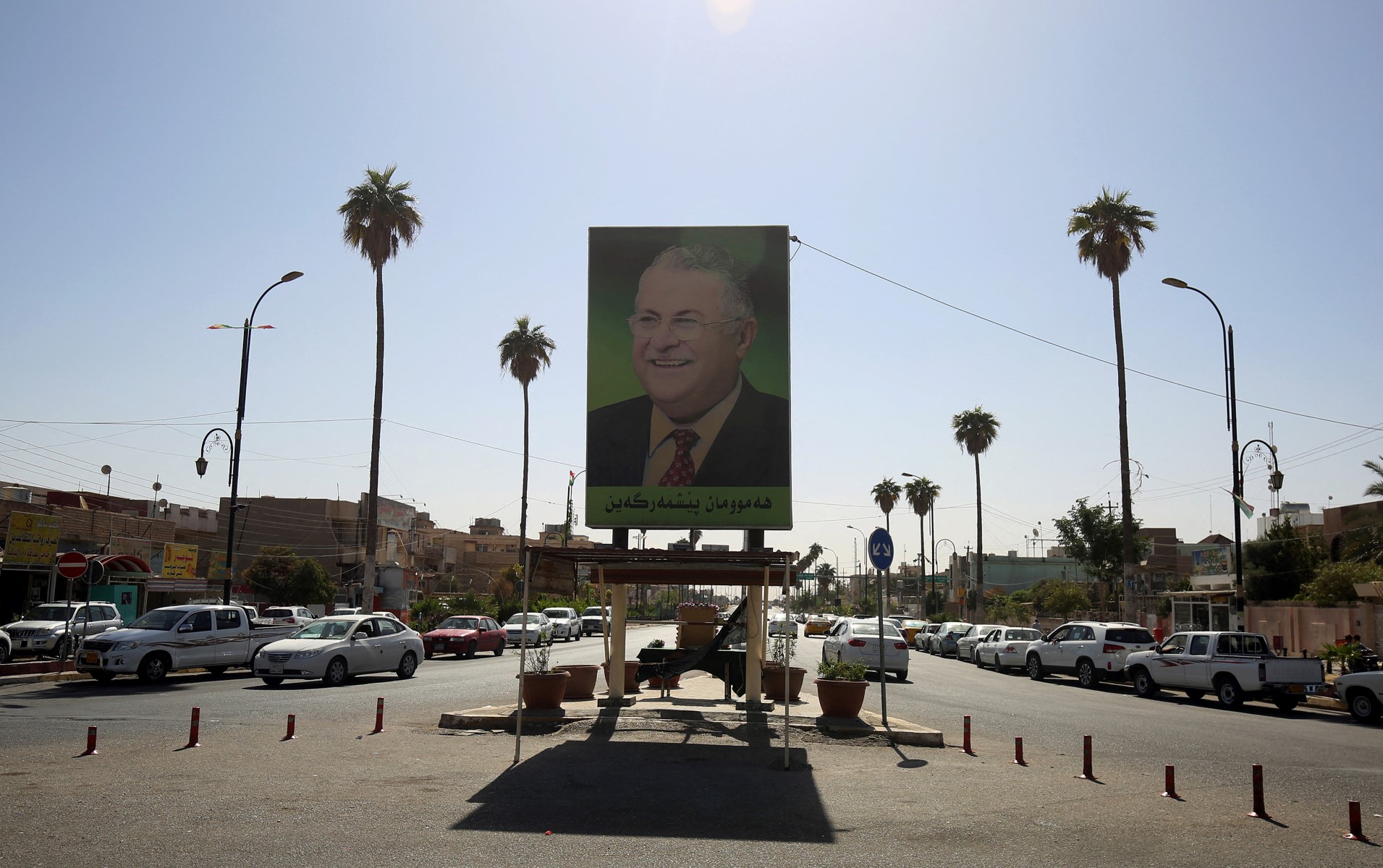 A picture taken on October 18, 2017, shows a portrait of late Iraqi president Jalal Talabani placed at a crossroad in the northern Iraqi city of Kirkuk. (Photo by AHMAD AL-RUBAYE / AFP)