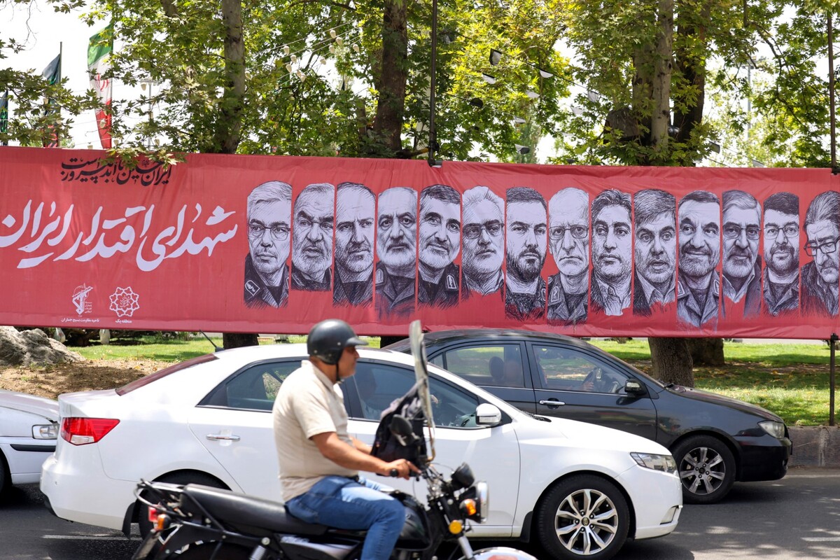 Traffic moves past a large banner depicting Iranian commanders and scientists killed in Israeli strikes during the 12-day war between Iran and Israel, at Tajrish Square in the capital Tehran on June 30, 2025. (Photo by ATTA KENARE / AFP)
