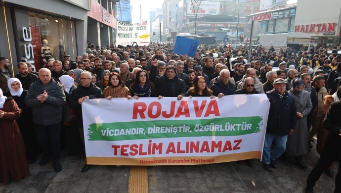 During the Platform of Democratic Institutions’ protest, participants stated, “Attacks in Aleppo mean no peace in Turkey. Just as we defended Kobanê in 2014, we will defend Rojava today.”