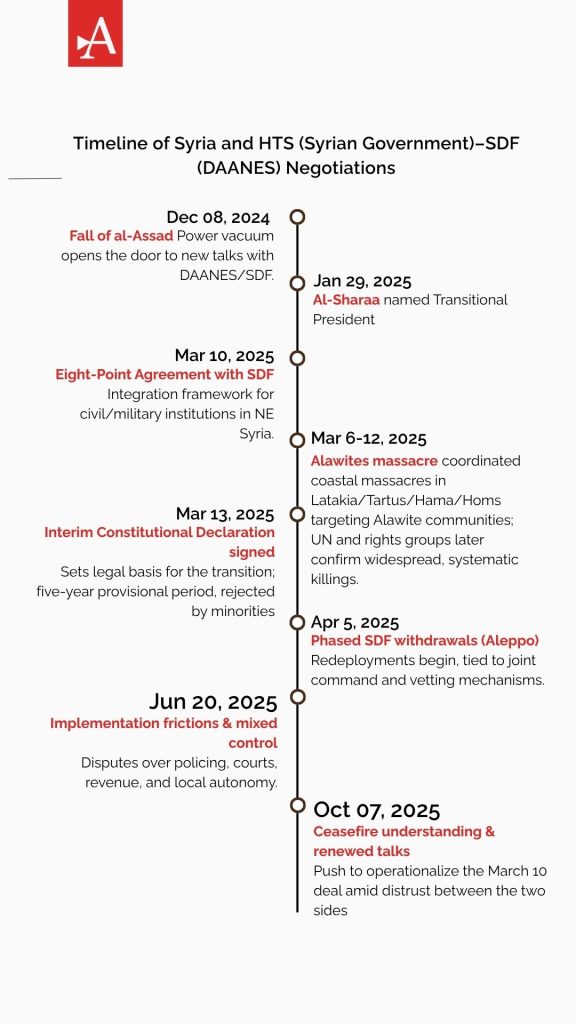 The DAANES delegation met with a Syrian Transitional Government delegation led by Syrian Interim President Ahmed al-Sharaa on 7 October 2025 in Damascus, following clashes between the Syrian Democratic Forces (SDF) and militia groups affiliated with the Syrian Transitional Government in Aleppo. The DAANES delegation consisted of SDF General Commander Mazlum Abdi, DAANES foreign affairs co-representative Ilham Ehmed, and Women’s Protection Units (YPJ) commander Rohilat Efrîn. The transitional government was represented by interim president Ahmed al-Shara and foreign minister Assaad al-Shaibani.