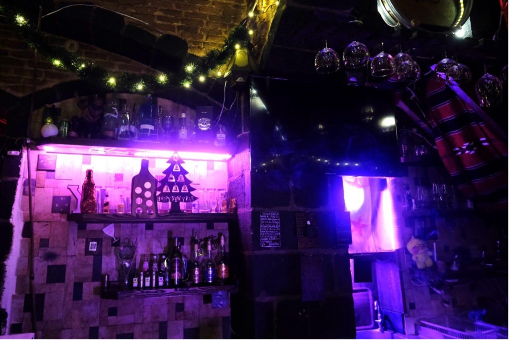 It is midday and the bar is sober. No clinking glasses, no raised voices, only Christmas music crooning softly through a speaker behind the counter. The interior is old Damascus style: dark wood, thick stone walls polished smooth by decades of hands, smoke, and alcohol-stained breaths. A glowing Happy New Year sign hangs above the bar, and Christmas trees stand in the corners; their purple, red, green, and yellow lights flicker against matte walls.