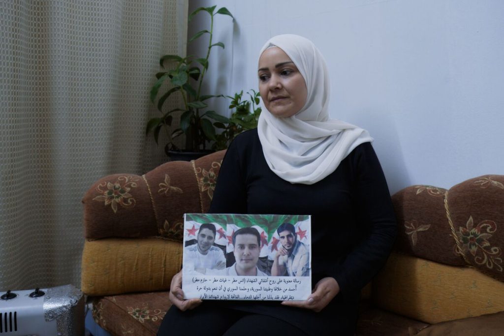 Eynas Matar lost three of her brothers to the brutal Assad regime – two of them, Anas and Hazem, disappeared in prison. On the wall of her apartment, she had their portraits where they appear smiling in front of Syria’s green, white, and black flag.