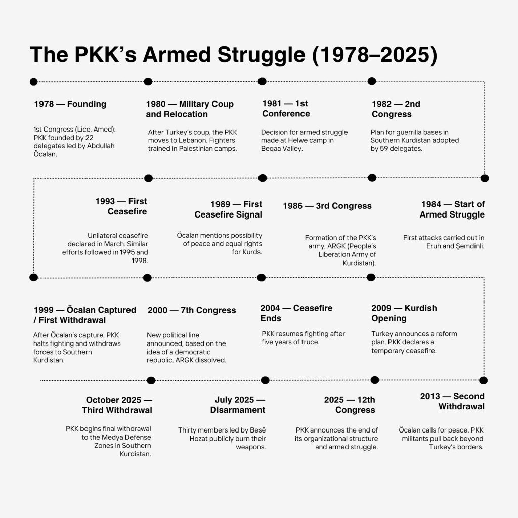 This decision follows the PKK’s 12th Congress in May 2025, during which the group declared its dissolution and ended its military-focused strategy, aligning with Abdullah Öcalan’s 27 February call for a transition to “peaceful and democratic means.” To signal that the PKK had completely dissolved, the statement was read under “the leadership of the Kurdish Freedom Movement” rather than the PKK.
