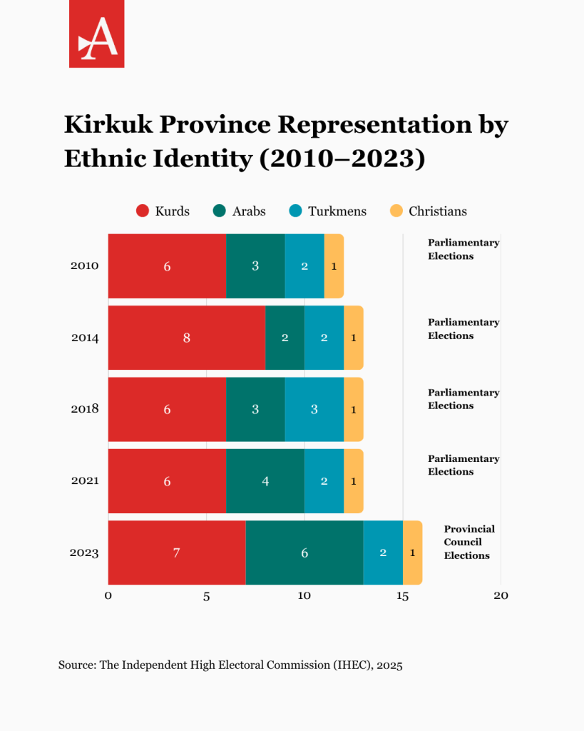 Every election in Kirkuk revives old disputes over land, power, and belonging. Campaigns that begin with talk of services and jobs quickly turn into contests of identity. “The competition over votes among the various ethnic and political groups has intensified,” says Shwan Dawdi, a political analyst from Kirkuk. “Each community now understands its own electoral capacity and no longer expects support from others.” Consequently, the result is that Kurds mainly compete within themselves for about six seats, Arabs for four, and Turkmen for two.