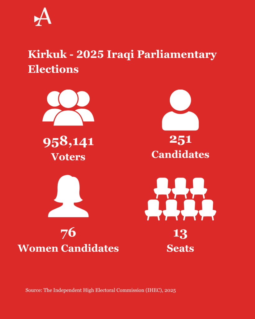 Kirkuk is where Iraq’s deepest issues converge. Home to 1.77 million people and rich in oil, the province is split among the Kurdish, Arab, and Turkmen communities. The winner of an election rarely governs here alone, and the loser rarely accepts defeat. This year’s vote, Iraq’s sixth parliamentary election since 2005, allocates 13 seats to Kirkuk, including one seat in the Christian quota, and three seats reserved for women. Yet the province’s political and economic weight far exceeds its share in the legislature. 251 candidates — 76 of them women —are competing for the votes of 958,141 registered voters, at roughly 74,000 votes per seat.