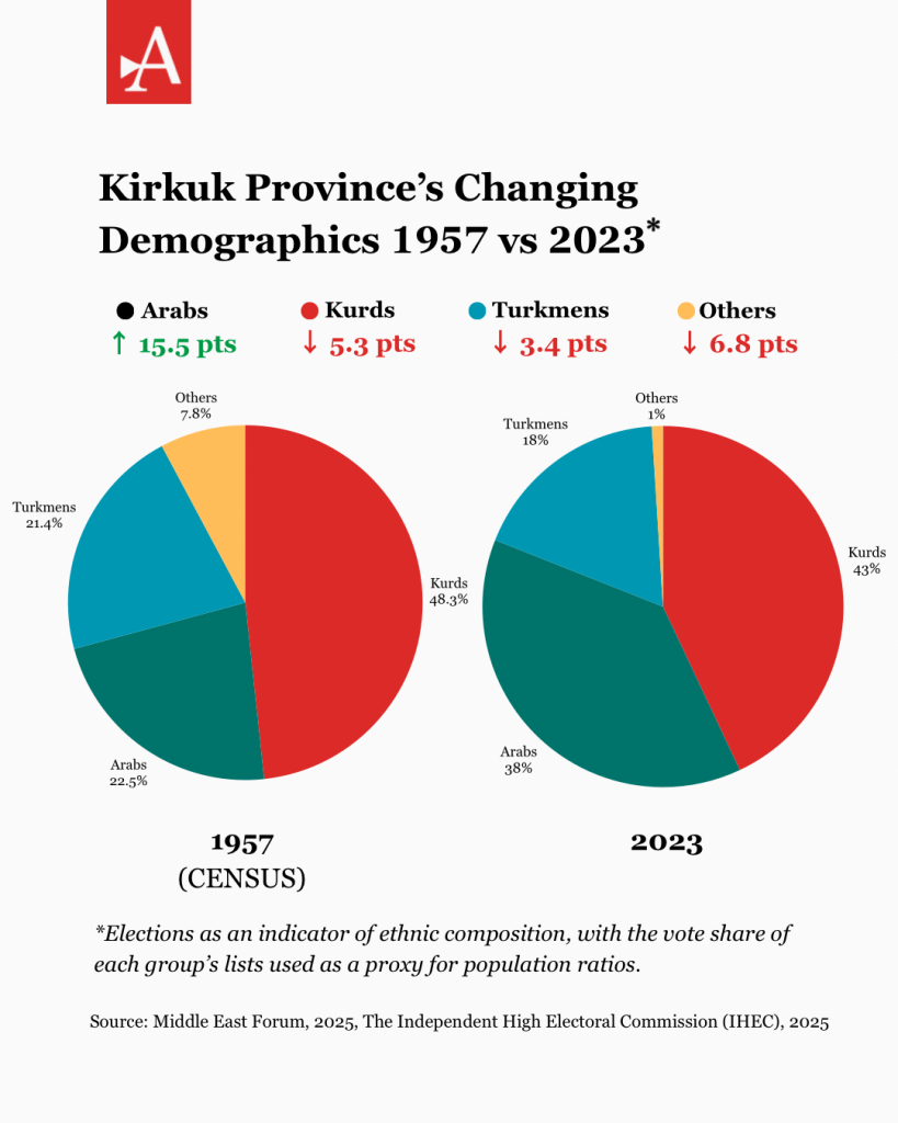 Kirkuk’s demographics help elucidate the tensions. In 1957, Kurds made up 48.3% of the population of Kirkuk province, Arabs 22.5%, Turkmens 21.4% and the rest consisted of Assyrians and other ethnic groups. Decades of Ba’ath-era Arabisation and subsequent political upheavals have since reversed that balance. Given the lack of a recent census that identifies ethnicity, elections now act as a proxy for demographic trends. Kurdish votes fell from 54% in 2014 to 43% in 2023, while Arab support rose from 28% to 38% and Turkmen from 17% to 18%. These shifts indicate how demographic engineering and shifting power patterns since 2017 have transformed Kirkuk’s social and political landscape. The Kirkuk referendum was intended to resolve this issue and determine whether disputed areas, including Kirkuk, Diyala, Salah ad-Din, and Nineveh, would join the Kurdistan Region of Iraq. Originally planned for November 2007 but repeatedly postponed, the vote remains unscheduled since Article 140 of Iraq’s constitution requires reversing Saddam-era Arabisation before holding the plebiscite, a process complicated by the return of thousands of displaced Kurds after 2003.