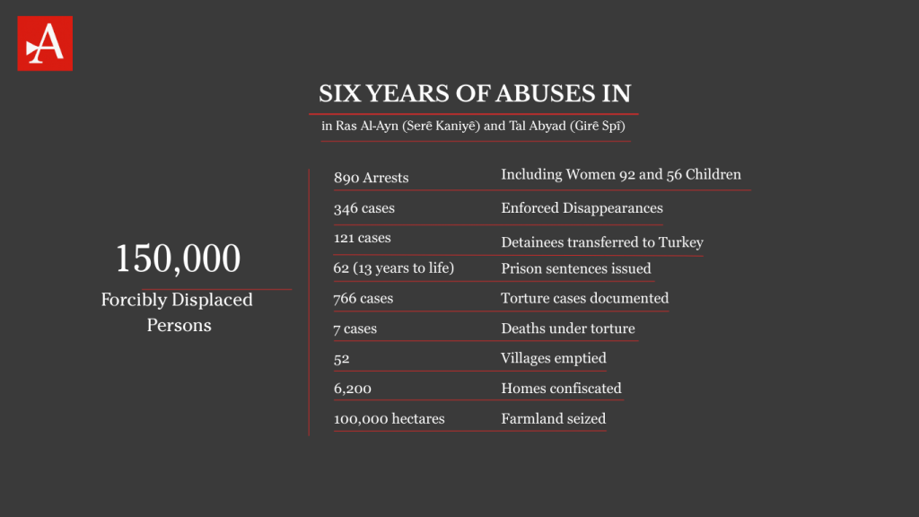 A recent report by the Synergy Association for Victims and interviews by The Amargi detailed six years of systematic abuses by SNA divisions in Ras Al-Ayn (Serê Kaniyê) and Tal Abyad (Girê Spî), summarized in the following: